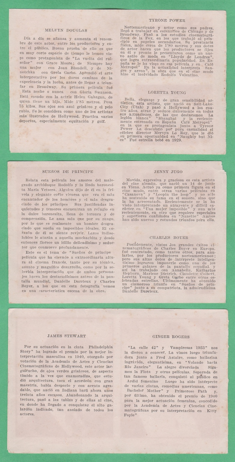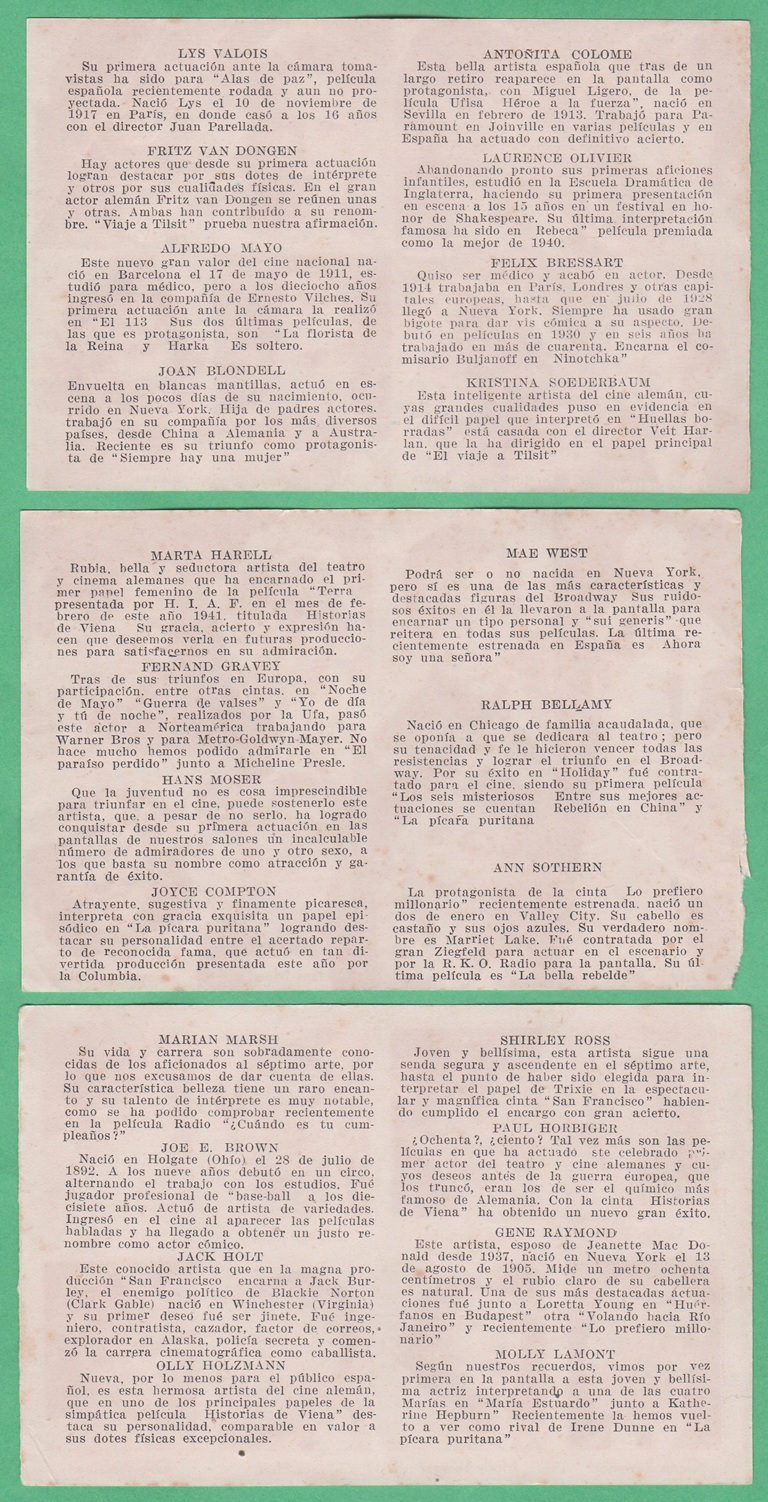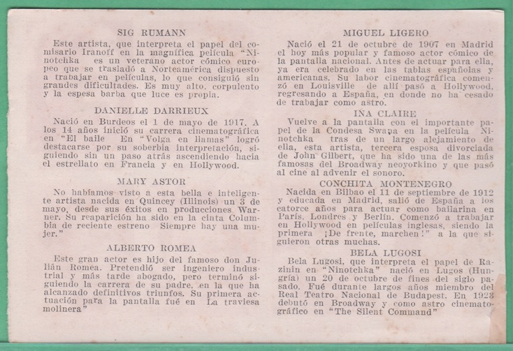 Anonymous Film Stars (Multiple Stars Per Card) - Miguel Ligero - Ina Claire - Sig Rumann - Daniela Darrieux - Conchita Montenegro - Bela Lugosi - Mary Astor - Alberto Romea (Back)