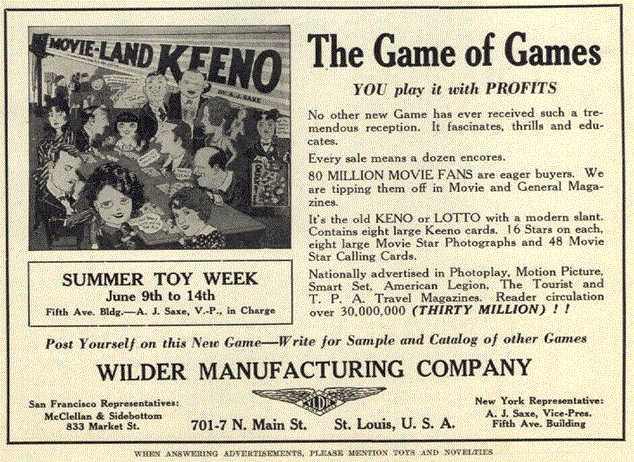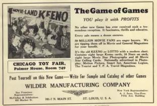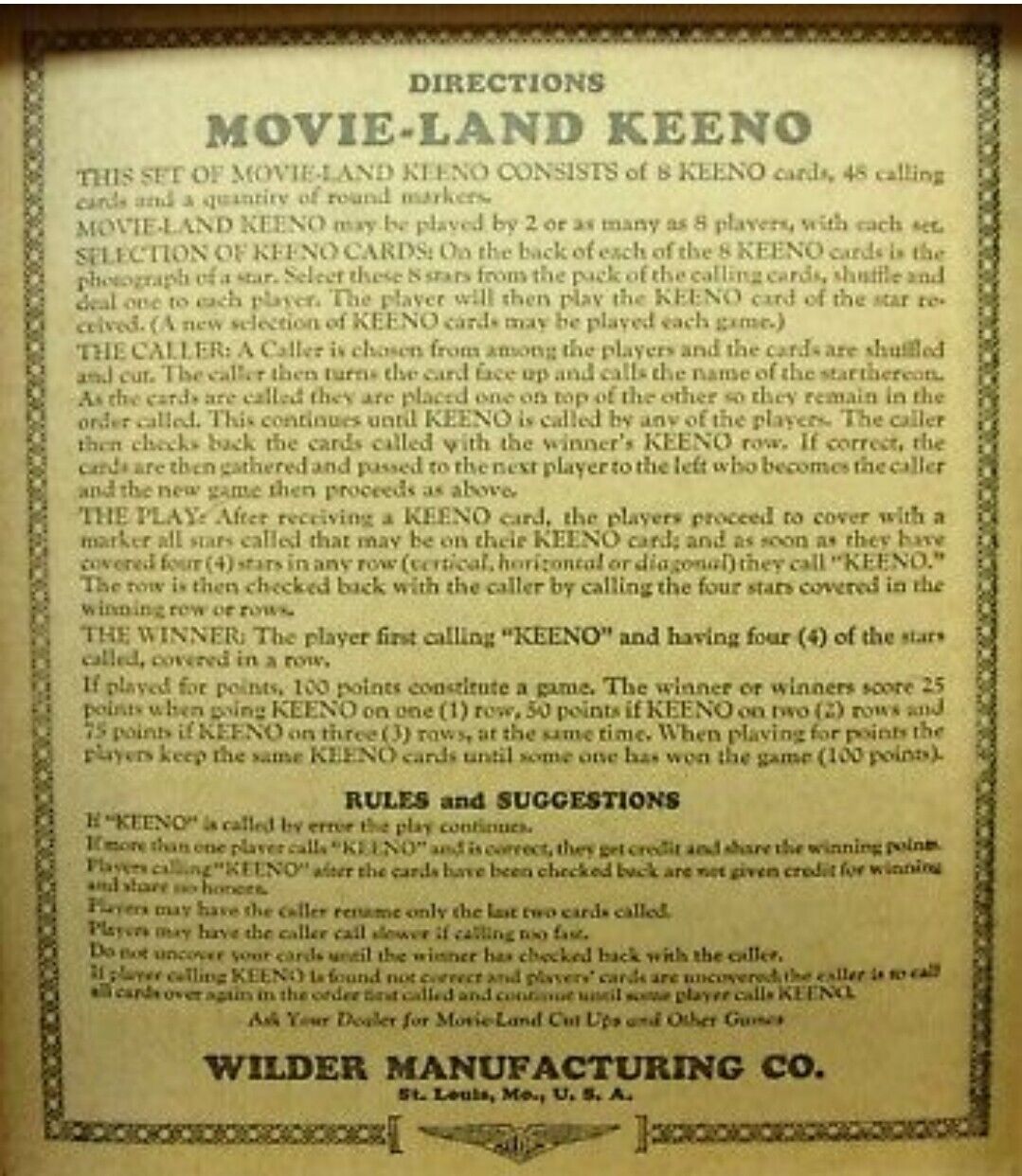 WILDER MFG. CO Movie Land Keeno 2 issues - 1929 and 1930 both sets have 8 large keeno cards, 48 calling cards Comprehensive information available at www.moviecard.com and www.immortalephemera.com |