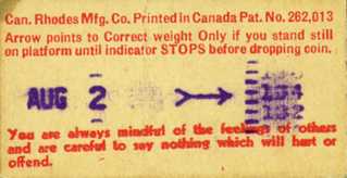 Weight Machine Card, issued by Can. Rhodes Mfg. Co. in Canada in 1934