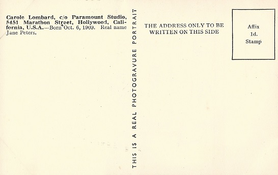 Girls' Crystal Film Star Postcards - Carole Lombard Postcard Back (with Girls' Crystal Notation)