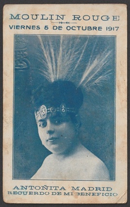Notes: Blank backed. Interestingly, the Moulin Rouge in Paris was closed from 1915 until 1921 due to a fire so no acts appeared there in this period. It is possible that this card was based on El Molino - which was known as the Moulin Rouge of Barcelona known for hosting revue, cabaret and burlesque acts. This card seems likely to be an advertisement of one such act though little is known about the star advertised on front: Antonita Madrid.