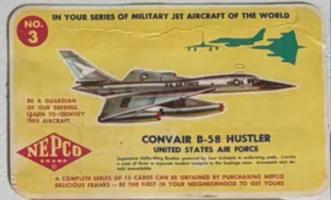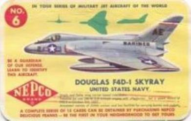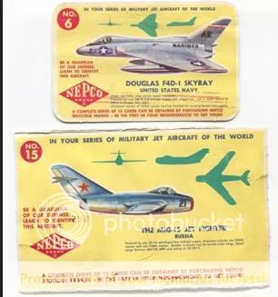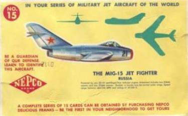 Nepco brand (hot dogs) Military Jet Aircraft Of The World - F (unc) 1950s ... two sets, each having 15 cards one set larger than the other 5 5/8" x 3" and 6 1/4" x 4" Contributors - Todd Riley, Mark Edmunds |
