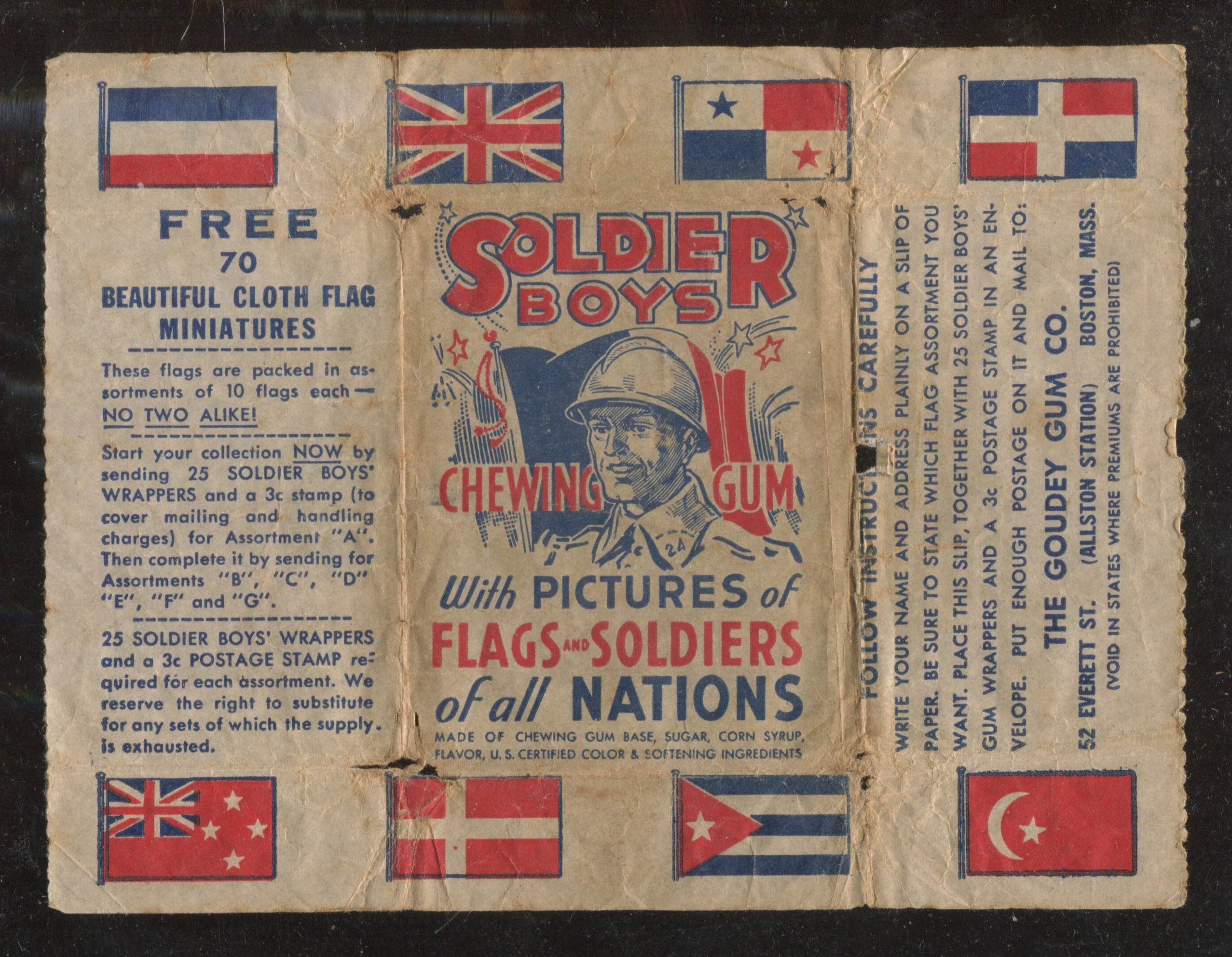 Information - Bill Oliver Goudey National Flags are a mail-away premium associated with R142 Soldier Boys. The wrapper indicates there are 70 in total that came in packs of 10. Only a few have been checklisted and even fewer images are available. |