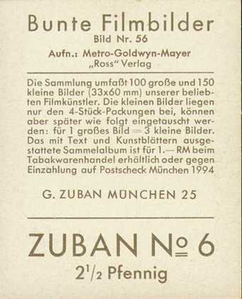 Bunte Filmbilder, Issued with Zuban cigarettes in Germany in the 1930s (the Bunte Filmbilder set was also issued with many other cigarette brands, including Austria, Caid, Greiling, Orienta, and Zig. Bilderdienst Dresden)