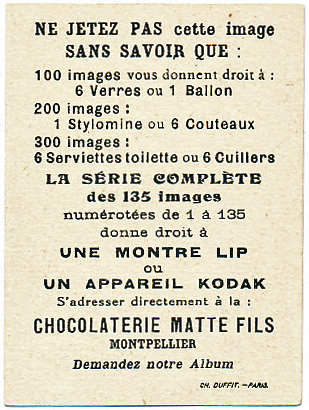 Nestle, issued in Belgium in the 1930s (This is a variation of a card shown from the card above. This card has a different back, as issued in Belgium. The one shown above was issued in England. It is likely these cards can be found with backs from additional countries.) (Picture courtesy of Alphons Bakker)