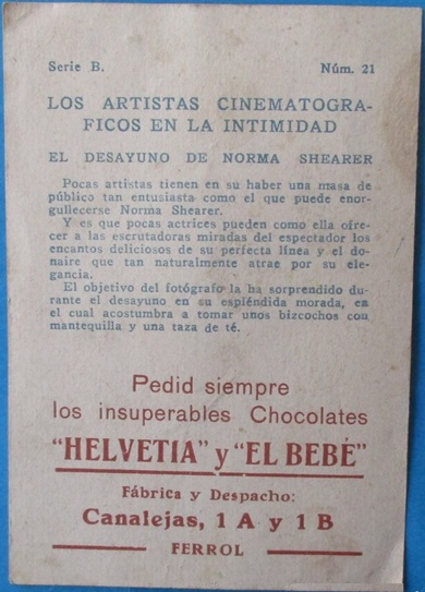 Amatller Los Artistas Cinematograficos en la Intimidad - #B 21. Norma Shearer (Helvetia back)