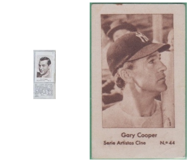 Serie Artistas Cine - Two Variations for #44 Gary Cooper - 1st card from an album, 2nd card showing Cooper in New York Yankees hat from film "Pride of the Yankees"