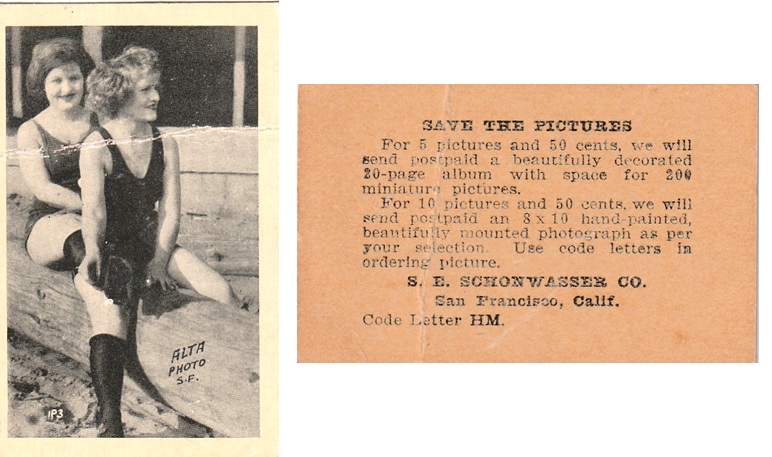 In the ACC, Jefferson Burdick classified this set as E281 and called them Sennett Girls. I checked with an expert on Mack Sennett girls, and he didn't think the girls on these cards were Mack Sennett girls. There is no mention of Mack Sennett on the cards. I think Burdick was mistaken in this classification. I think he just saw that they looked like the Mack Sennett girl cards since these were girls on the beach, and named them the same.